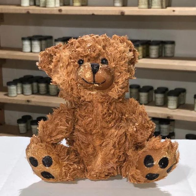 Teddy Hughes is about 7 inches and is a Scented Wax Dipped Teddy Bear. He is not a toy and should not be placed around any open flames. Please be mindful where you place Teddy Hughes and Use Caution, This Product May Stain Surfaces.